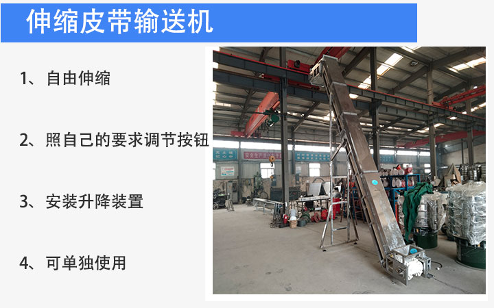 伸縮皮帶輸送機是在普通皮帶輸送機上增加了伸縮機構,可以在長度方向上自由伸縮,隨時控制輸送機的長度,可雙向輸送物料,也可與其他設備配合使用